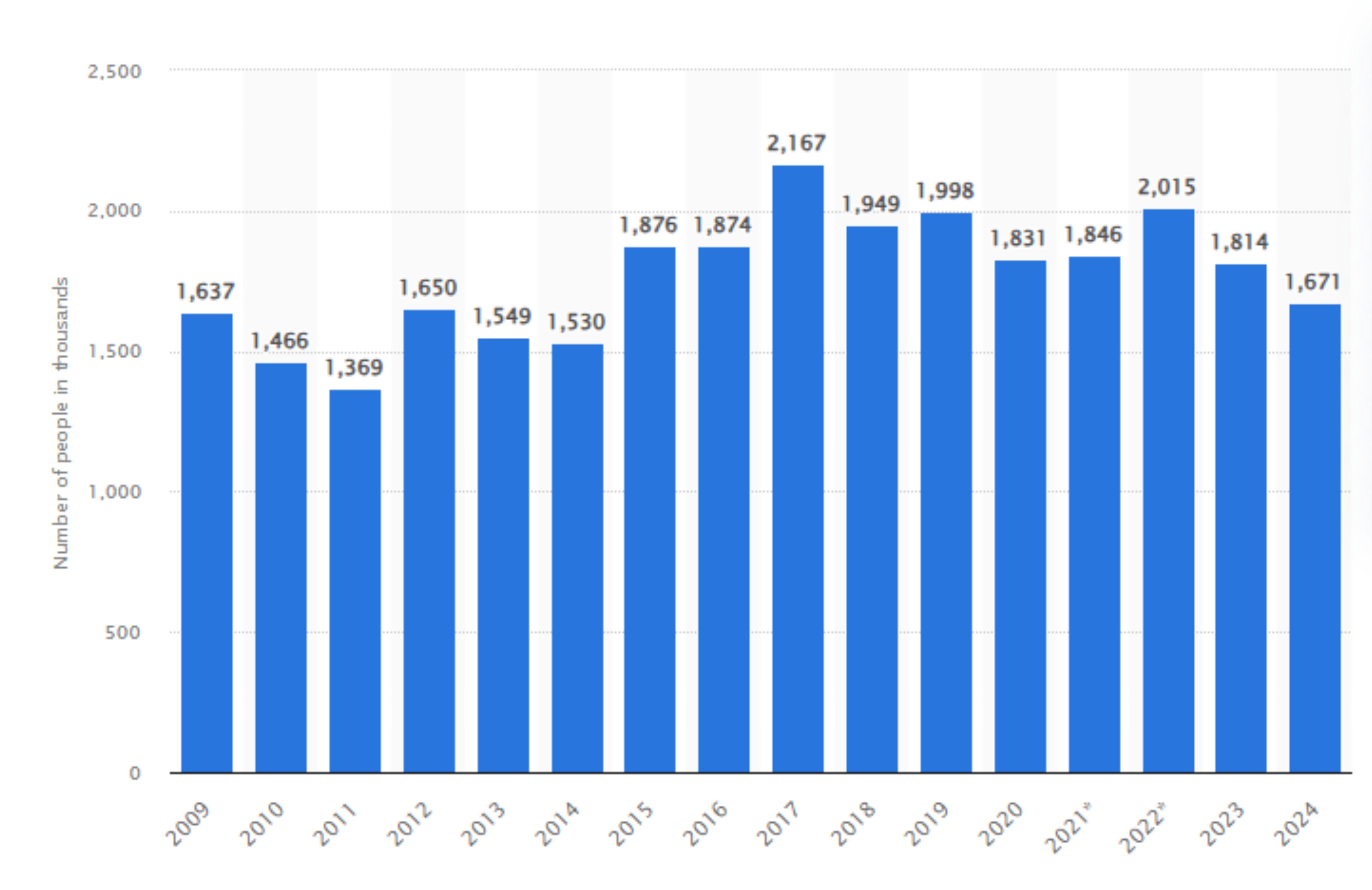Number of people in the U.S. who used cocaine in the past month from 2009 to 2024 (in 1000)